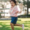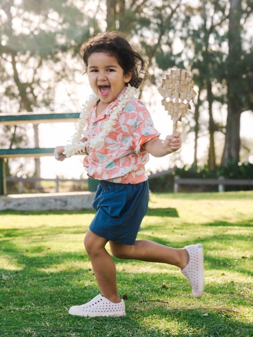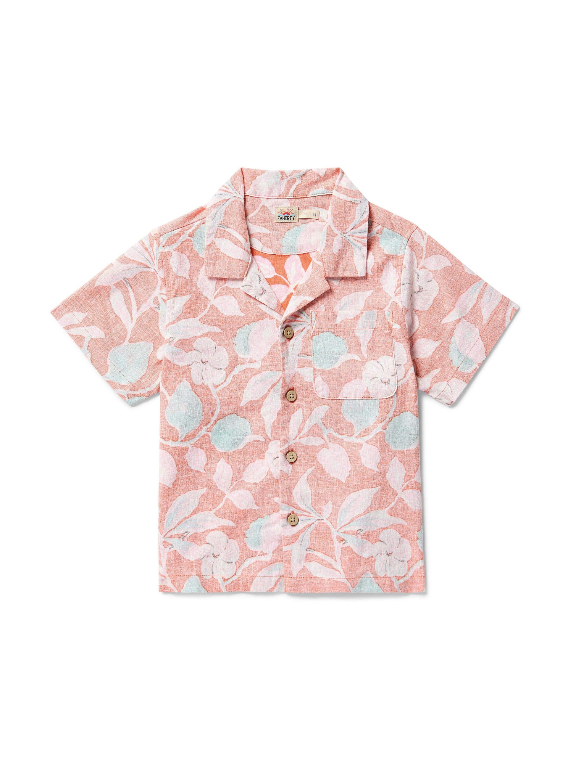 For fun-filled summer days, we crafted this shirt from a buttery soft custom fabrication made primarily from linen. Lightweight with a bit of stretch, its unique hand feel also gives our signature travel-inspired prints an added natural texture. The camp collar styling is the perfect summertime kids shirt.