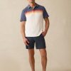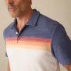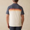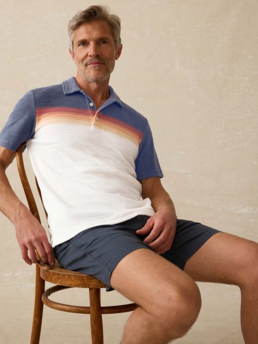 - Detail: Relaxed collar. Three-button placket. Short sleeves. Top applied chest stripes. Vented hem. Locker loop main label. Sun & Waves label at wearer’s left hem.
