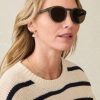 - Detail: Preppy round shape; Heritage striped metal hinge décor; Signature Faherty sun logo wearer’s left temple; Tag line “Sun & waves ” printed internal temple tip; polarized lenses Includes a soft drawstring case made of recycled cotton and polyester and a custom printed polishing cloth