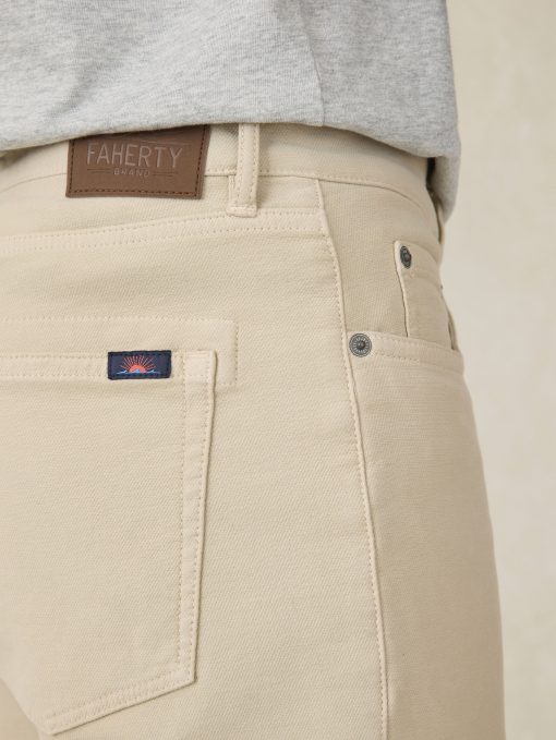 - Detail: Belt loops. Classic 5-pocket styling. Metal Rivets for pocket reinforcements. Metal fly zipper. Faherty logo back patch at wearer’s right.