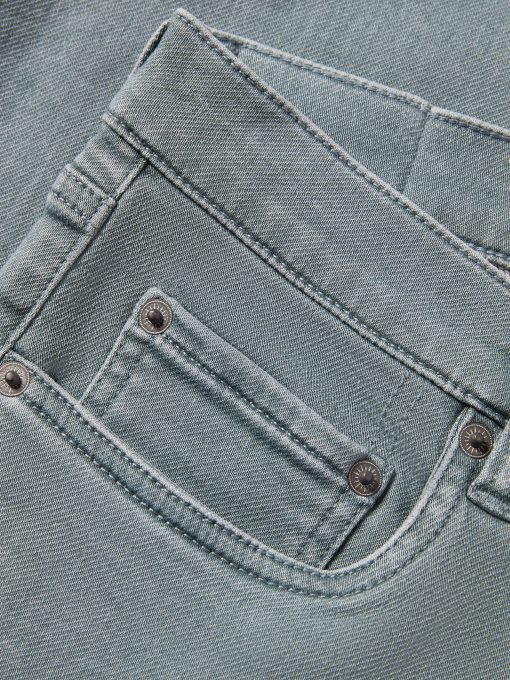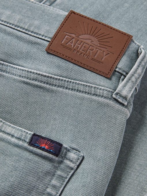 - Detail: Belt loops. Classic 5-pocket styling. Metal rivets for pocket reinforcements. Metal fly zipper. Faherty logo back patch at wearer’s right.