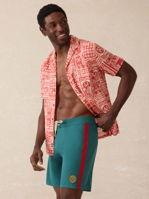 - Detail: Top applied stripes at outseams. Reverse entry zipper pocket at wearer’s right backside. Classic boardshort drawcord tie closure. Gusset fly with both velcro closure. Compression knit liner with media pocket on wearer’s left side. “Sankofa Surf Club” woven patch at wearer’s left hem. Faherty Brand woven label at center back of waistband.