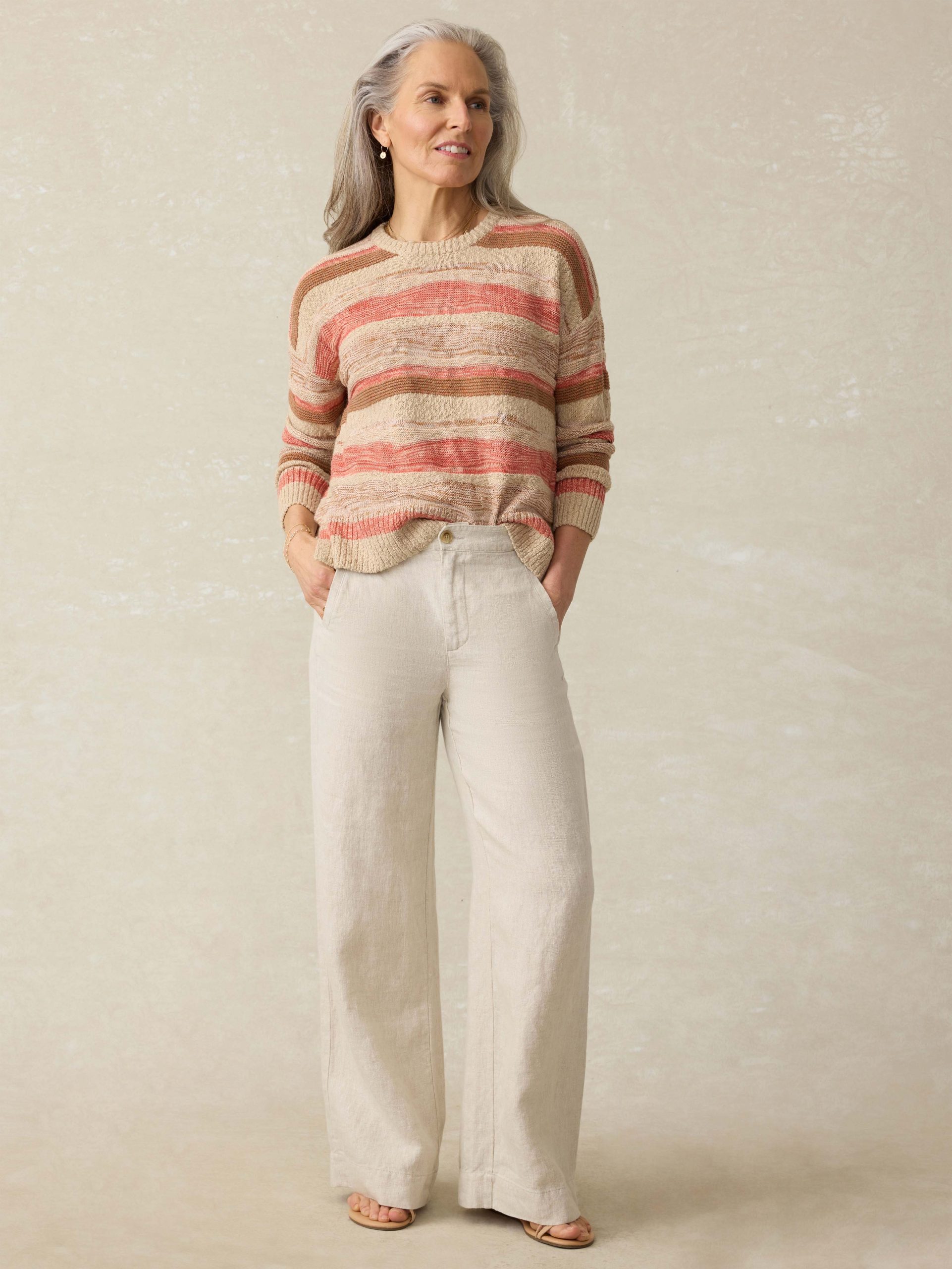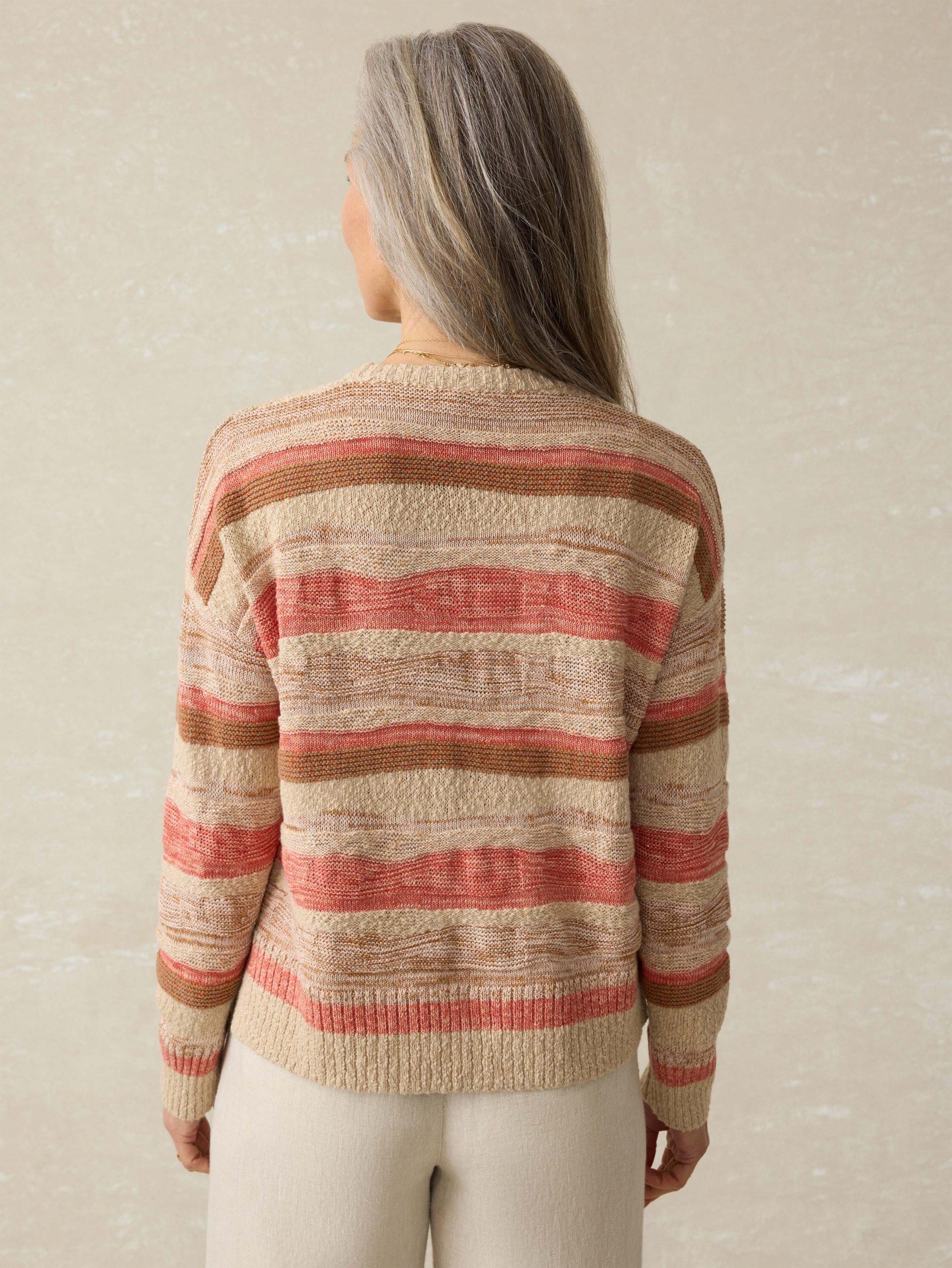 Featuring a playful mix of novelty stitches and cheerful, sun-kissed colors, this statement sweater is one of our faves of the season. Crafted from a lightweight linen-cotton blend, it’s perfect for transitional days.