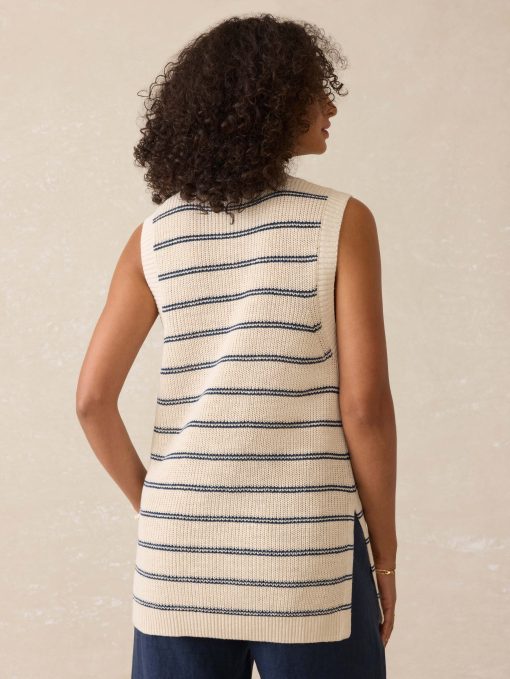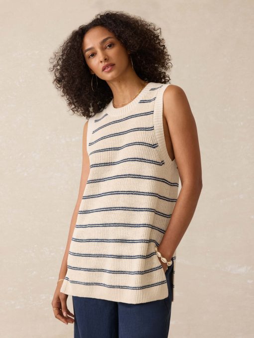 - Detail: Sleeveless tunic with rib trim details and side slits.