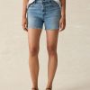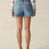 - Detail: 5-pocket denim short, vintage medium indigo denim wash with frayed hem.