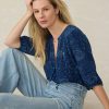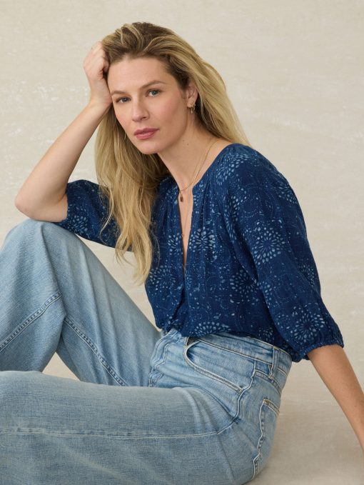 Hand-printed with genuine indigo. Wash separately as color may transfer.
