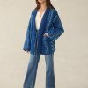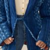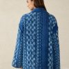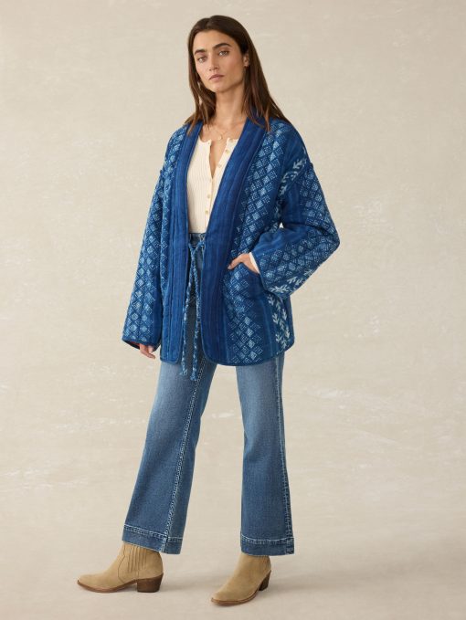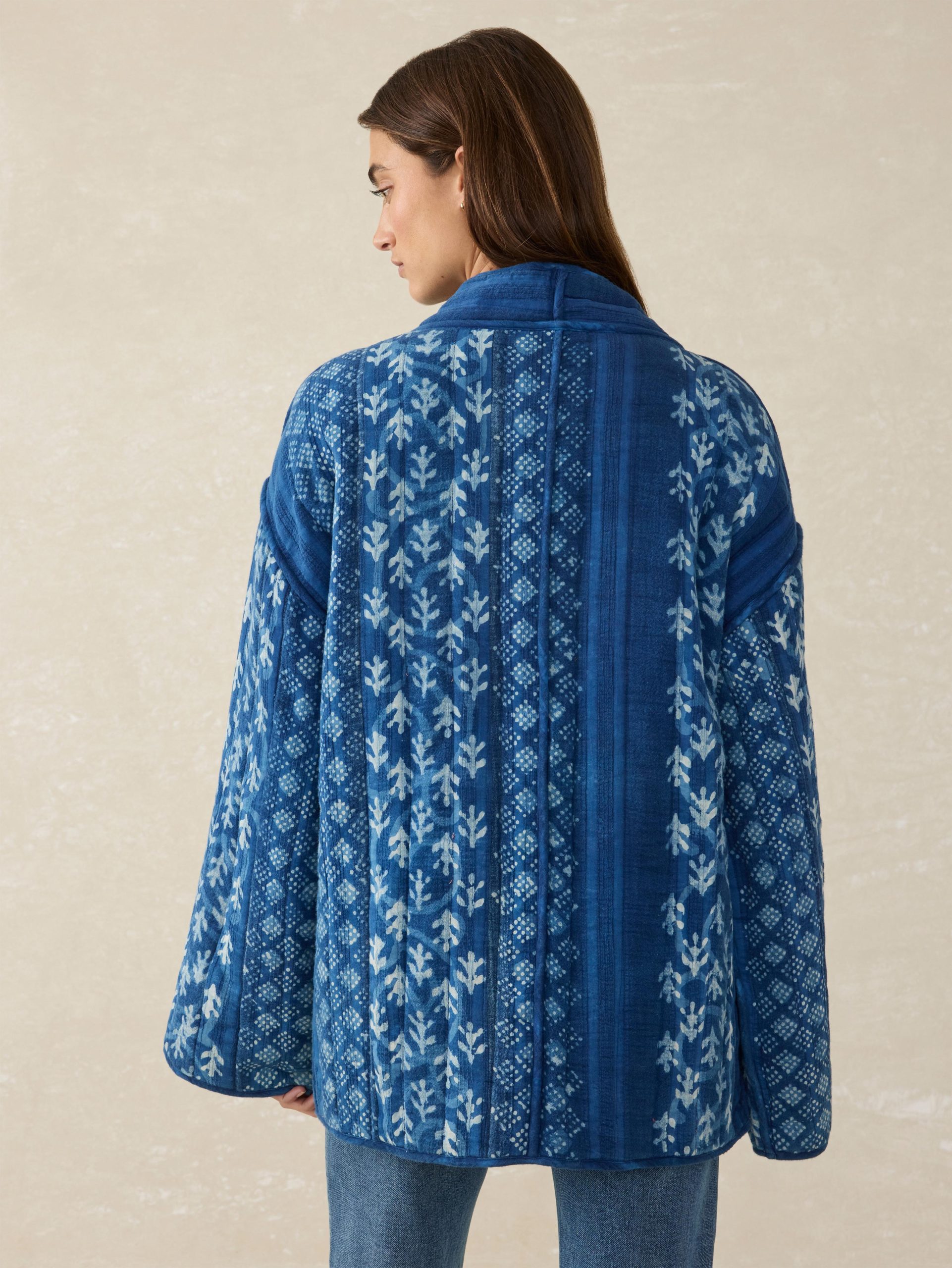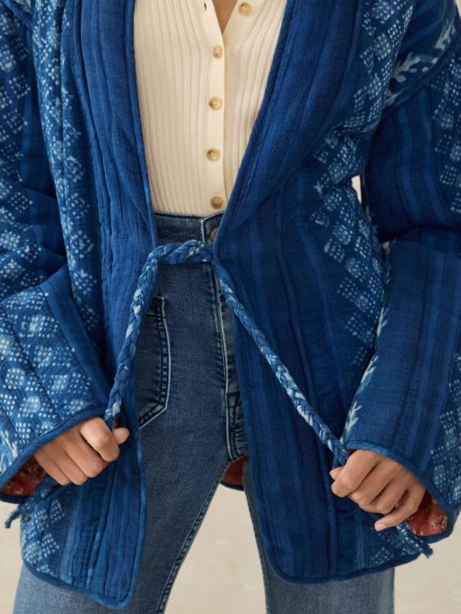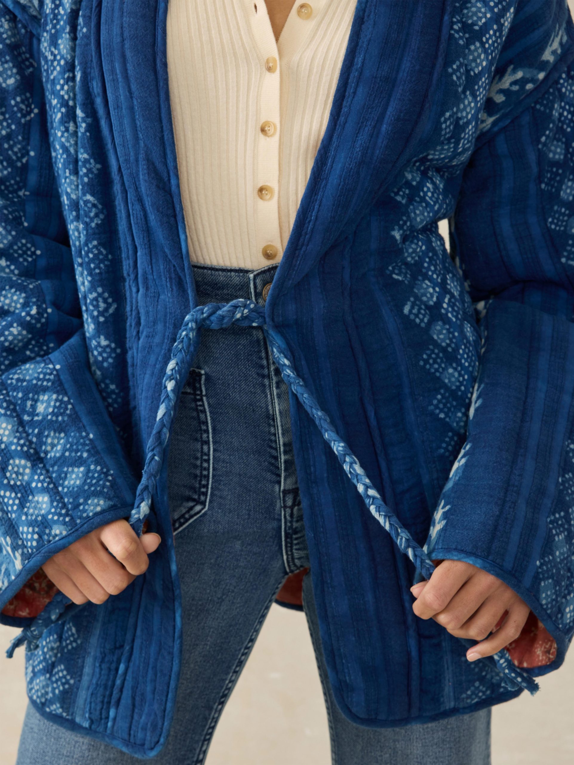 Transform your spring outfits with this quilted jacket, showcasing a beautifully crafted quilted pattern of hand blocked bandana prints in rich indigo hues. The braided tie closure adds a unique touch, while slant pockets at the front provide practicality without compromising on style.