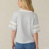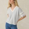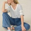 - Detail: V-Neck tee with contrast piecing details at neckline and sleeves. Clip label at bottom hem.
