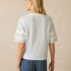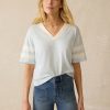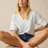 - Detail: V-Neck tee with contrast piecing details at neckline and sleeves. Clip label at bottom hem.