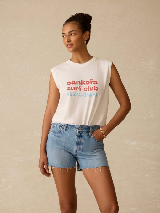 We consider the muscle tank one of summer’s essential tops. In our perfectly faded sunwashed treatment and graphic repping Surf Ghana, it strikes a nonchalant and lived-in cool that never goes out of style. The slightly cropped and breezy fit pairs perfectly with any summer short or skirt.